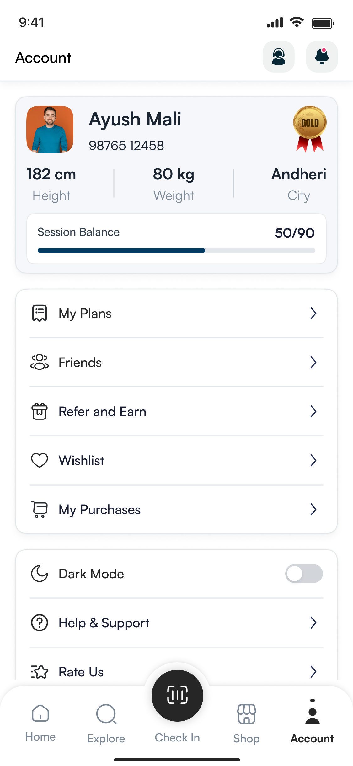 Monitor your check-in history, remaining sessions, progress, and gym activity all in one place.