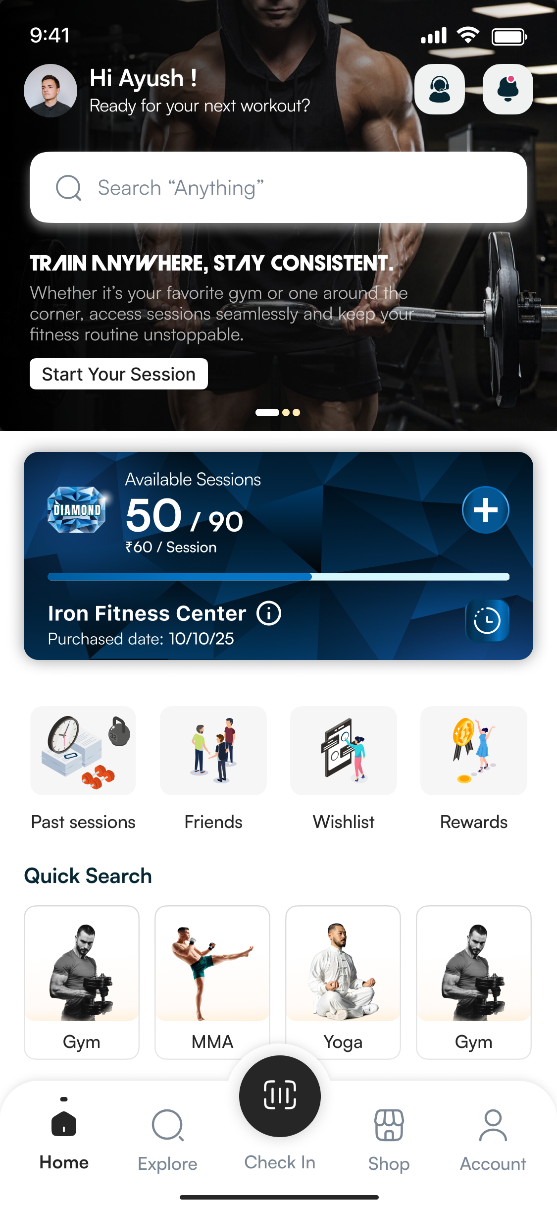 Monitor your check-in history, remaining sessions, progress, and gym activity all in one place.