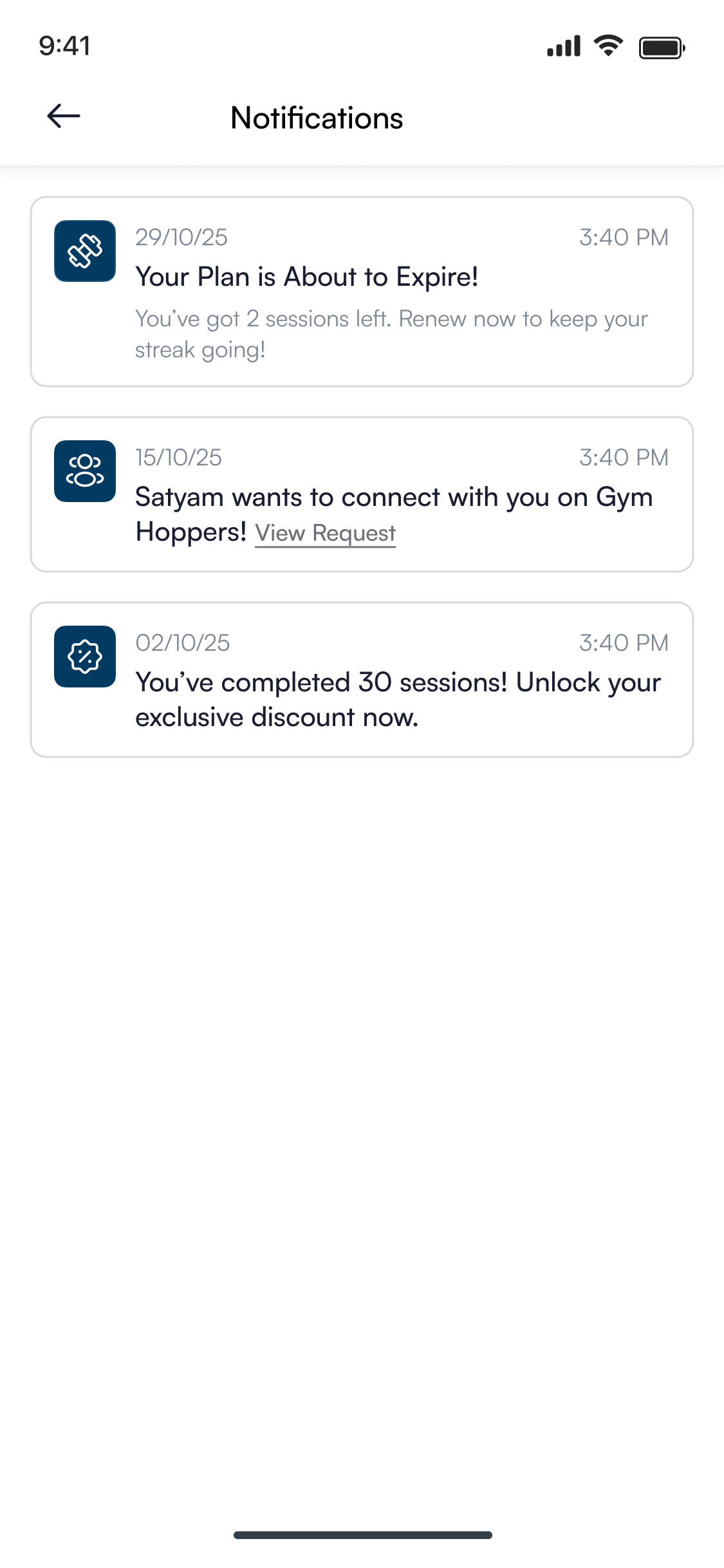 Don't just work out—master your entire fitness routine. GymHoppers transforms session tracking, booking, and management into a smooth, simple experience, giving you full control over your journey from one smart platform.